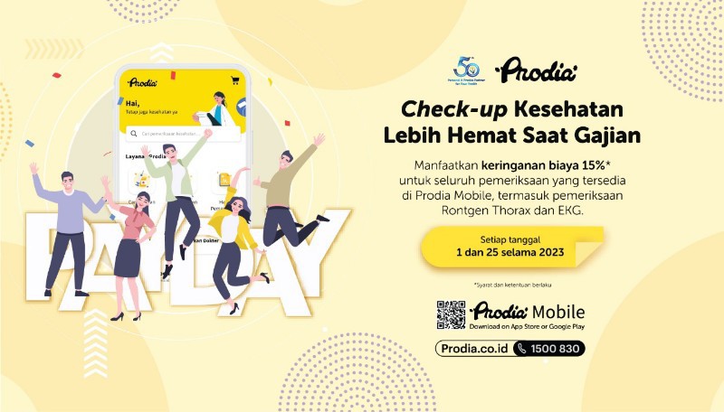 " Untuk menjawab segala permasalahan tersebut, Prodia menghadirkan Pay Day Healthy Day pada tanggal 1 dan 25 setiap bulan sepanjang 2023. Di mana, Anda bisa memanfaatkan keringanan biaya sebesar 15 % untuk seluruh pemeriksaan yang tersedia di Prodia Mobile termasuk Rontgen Thorax dan EKG, " jelas Partini.