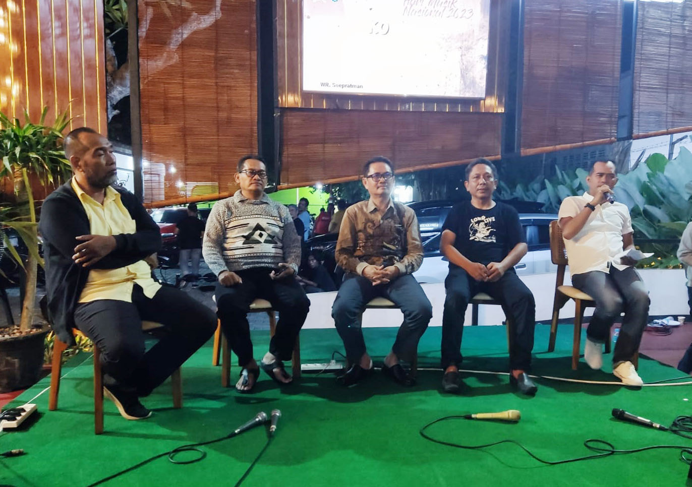 "Dari kiri : Narasumber Joko Wahono praktisi musik, Sumardi Dinas Budporapar, Nur Aziz anggota DPRD Jatim, Mashadi anggota DPRD Tuban, Amin moderator acara dalam dialog interaktif"