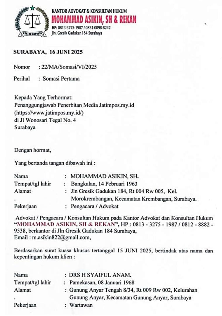 Surat somasi oleh tim lawyer Mohammad Asikin, SH & rekan kepada penanggung jawab media jatimpos.my.id