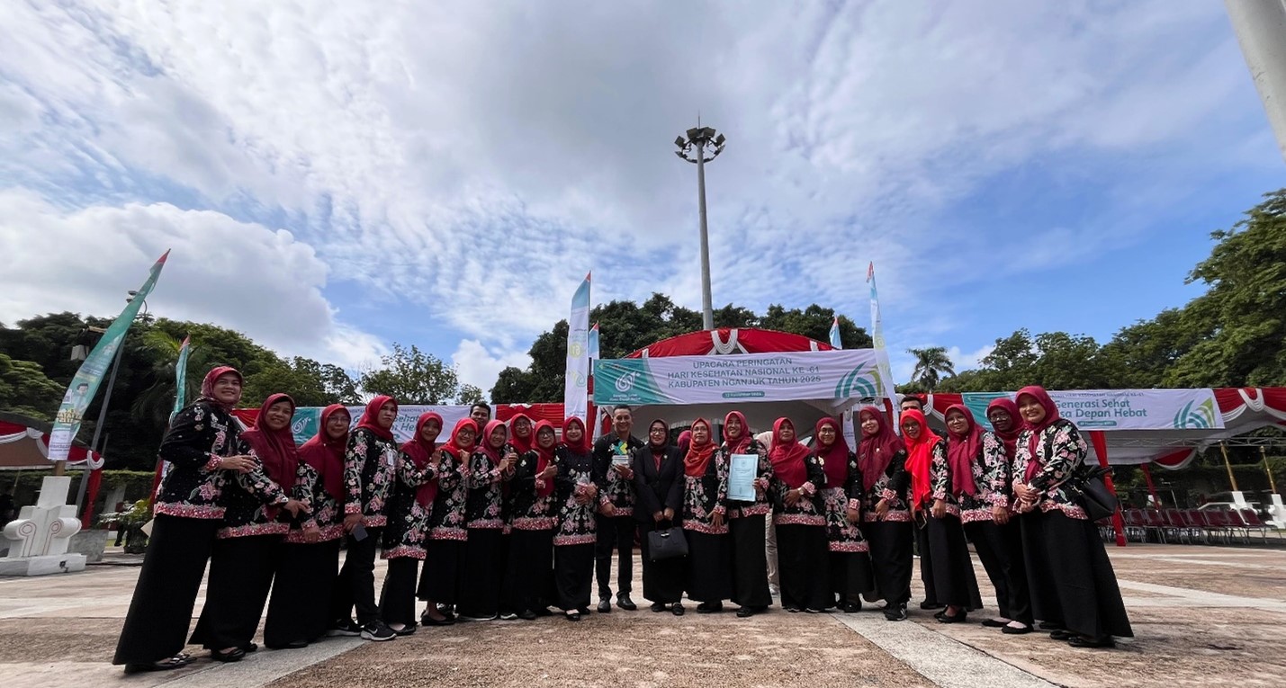 RSD Kertosono hadir dengan formasi lengkap, mengenakan seragam khas batik rumah sakit dengan kerudung merah yang seragam, mencerminkan semangat kebersamaan dan profesionalisme tenaga kesehatan. Suasana upacara berlangsung khidmat dengan latar panggung merah putih yang megah dan spanduk bertuliskan tema HKN, menambah semarak peringatan Hari Kesehatan Nasional tahun ini.