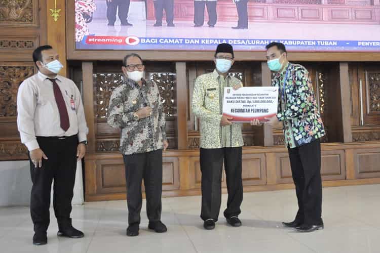 JATIMPOS.CO/TUBAN – Bupati Tuban Fathul Huda didampingi Wabup Noor Nahar Hussein menyerahkan insentif prestasi pemungutan Pajak Bumi dan Bangunan Perdesaan dan Perkotaan (PBB-P2) tahun anggaran 2020 di Pendapa Kridho Manunggal, Selasa (01/12).