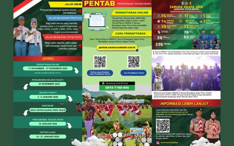 JATIMPOS.CO//KOTA KEDIRI - SMAN 5 Taruna Brawijaya Jawa Timur kembali membuka Penerimaan Taruna Baru (PENTAB) 2026/2027. Pendaftaran online dibuka selama 40 hari mulai tanggal 17 November hingga 27 Desember 2025.