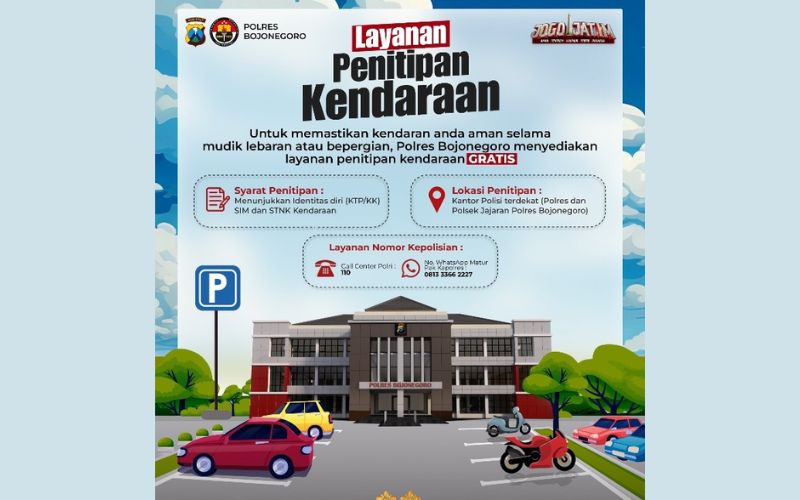 JATIMPOS.CO/BOJONEGORO - Polres Bojonegoro, Polda Jawa Timur, menyiapkan layanan penitipan kendaraan gratis bagi masyarakat yang akan mudik Lebaran. Layanan ini bertujuan memberikan kemudahan dan keamanan bagi masyarakat yang tidak ingin membawa kendaraannya saat mudik.