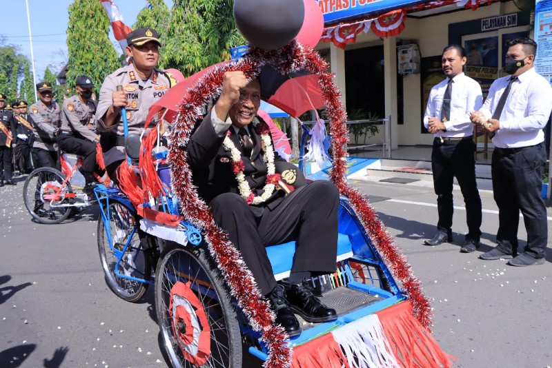 Kapolres Madiun Kayuh Becak Antar Anggota Polres Madiun yang Masuk Purna Bakti