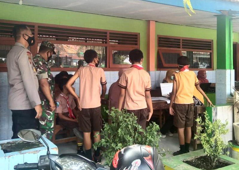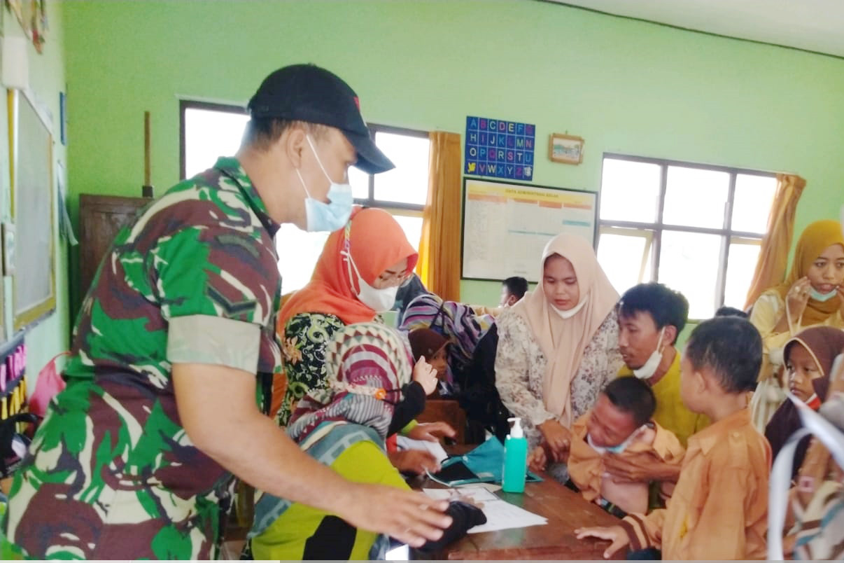 JATIMPOS.CO/TUBAN - Program vaksinasi telah menyasar pelajar usia 6 - 11 Tahun. Untuk itu Babinsa Koramil 14 kerek Kodim 0811 Tuban Serma Sapto dan Serda fauzi memonitoring sekaligus mendampingi pelaksanaan vaksinasi yang digelar di SDN Margomulyo Kecamatan Kerek, Sabtu (18/12)