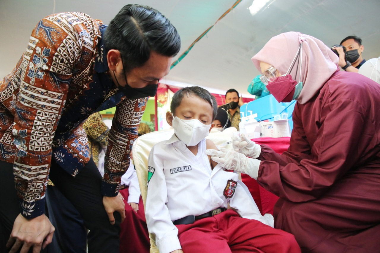 JATIMPOS.CO/TUBAN – Bupati Tuban, Aditya Halindra Faridzky meninjau pelaksanaan vaksinasi anak umur 6-11 tahun di MIN 1 Tuban dan SDN Kutorejo 1. Tinjauan Bupati didampingi Kapolres Tuban, AKBP Darman, Dandim Tuban, Letkol Inf Suhada Erwin, Kepala Kantor Kemenag Tuban, Sahid, Sekda Budi Wiyana, dan sejumlah pimpinan OPD terkait.