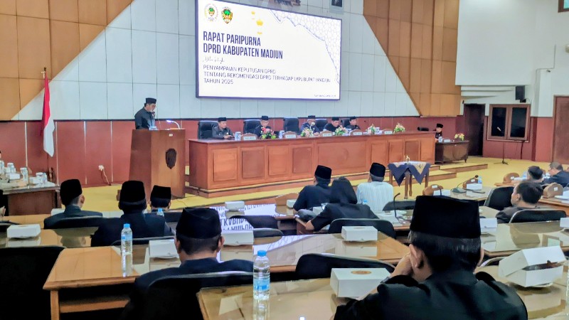 JATIMPOS.CO/KABUPATEN MADIUN — DPRD Kabupaten Madiun menggelar rapat paripurna dalam rangka penyampaian keputusan DPRD terkait rekomendasi terhadap Laporan Keterangan Pertanggungjawaban (LKPJ) Bupati Madiun Tahun Anggaran 2025, di ruang rapat paripurna DPRD setempat, Kamis (2/4/2026).