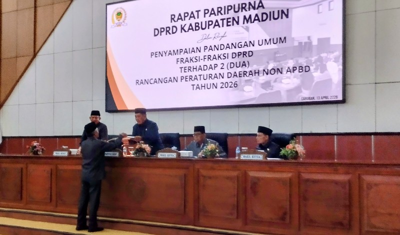 JATIMPOS.CO/KABUPATEN MADIUN — DPRD Kabupaten Madiun menggelar rapat paripurna dengan agenda penyampaian pandangan umum fraksi-fraksi terhadap dua Rancangan Peraturan Daerah (Raperda) non-APBD Tahun 2026, Senin (13/4/2026).
