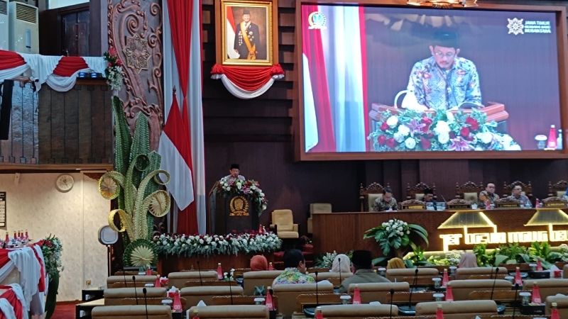 JATIMPOS.CO/SURABAYA — Gubernur Jawa Timur Khofifah Indar Parawansa menyampaikan jawaban eksekutif atas pemandangan umum fraksi-fraksi DPRD Jatim dalam rapat paripurna di Gedung DPRD Jatim, Jumat (22/8/2025) siang.