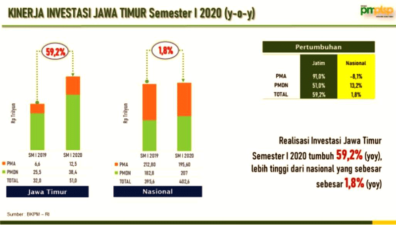 Berdasarkan data rilis resmi BKPM RI, pada periode Januari – Juni 2020 ini, total investasi (PMA dan PMDN) di Jatim senilai Rp. 51 Triliun yang terdiri dari PMA sebesar Rp. 12,5 Triliun, dan PMDN sebesar Rp. 38,4 Triliun. Secara nasional, capaian ini menduduki peringkat kedua, setelah Jawa Barat yang mencatatkan angka realisasi Rp. 57,9 Triliun. Di urutan ketiga bertengger DKI Jakarta dengan angka Rp. 50,2 Triliun.