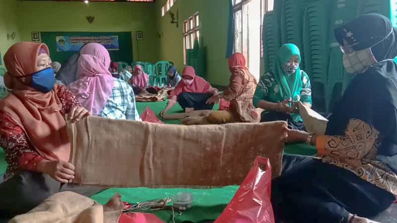 Peserta dari Usaha Mikro (UM) kerajinan dan masyarakat di Kabupaten Madiun membuat kerajinan craft dari bahan karung goni.