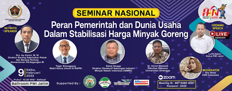 JATIMPOS.CO/SURABAYA - "Peran Pemerintah dan Dunia Usaha Dalam Stabilisasi Harga Minyak Goreng", menjadi tema seminar nasional yang akan dihelat PWI Jatim guna menyemarakkan Hari Pers Nasional (HPN) 2022. Acara ini akan digelar secara online dan offline pada Rabu (9/2) besok pukul 13.00-16.30.