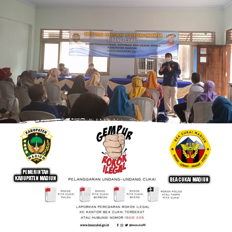 JATIMPOS.CO/KABUPATEN MADIUN - Pemerintah Kabupaten (Pemkab) Madiun melalui Dinas Perdagangan, Koperasi dan Usaha Mikro (Dinperdagkop dan UM) Kabupaten Madiun menggelar sosialisasi Peraturan Perundang-Undangan Bidang Cukai di Gedung Koperasi Unit Desa (KUD) Dolopo, Kecamatan Dolopo, Kabupaten Madiun, Senin (8/11/2021).