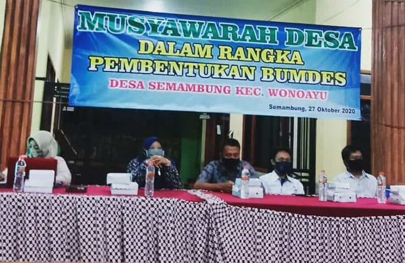 JATIMPOS.CO/SIDOARJO - Musyawarah Desa (Musdes) tentang sosialisasi dan pembentukan Tim perumus AD/ART dan juga Perdes BUMDes Desa Semambung Kecamatan Wonoayu Sidoarjo, telah dilakukan pada hari Selasa malam 27 Oktober yang bertempat di pendopo Balai Desa Semambung, Rabu (28/10/2020).