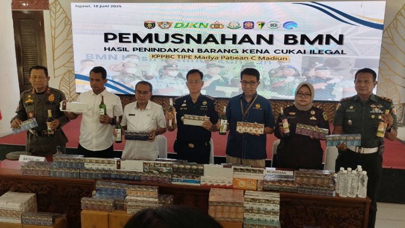 JATIMPOS.CO/KABUPATEN NGAWI – Kantor Pengawasan dan Pelayanan Bea dan Cukai Tipe Madya Pabean C Madiun memusnahkan Barang Milik Negara (BMN) hasil penindakan berupa barang kena cukai (BKC) ilegal di halaman Pendopo Wedya Graha, Kabupaten Ngawi, Rabu (18/6/2025).