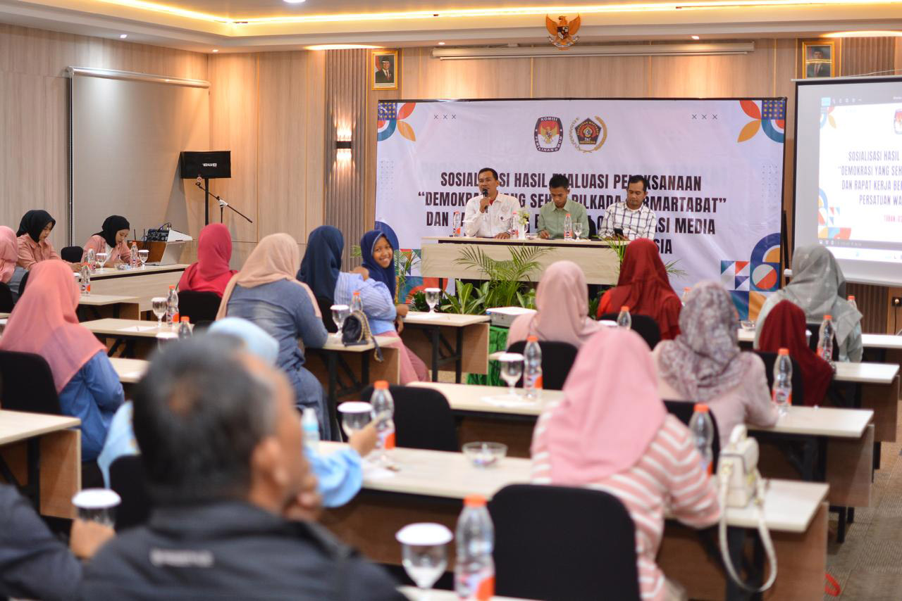 JATIMPOS.CO/TUBAN - Komisi Pemilihan Umum (KPU) dan Persatuan Wartawan Indonesia (PWI) di Kabupaten Tuban menggelar forum bareng. Pertama Sosialisasi Hasil Evaluasi Pelaksanaan Demokrasi Sehat, Pilkada Bermartabat dan rapat kerja organisasi mengawal pilkada, Minggu, 2 Februari 2025, di Lynn Hotel Tuban. Peserta sosialisasi di antaranya para istri wartawan yang tergabung di PWI.