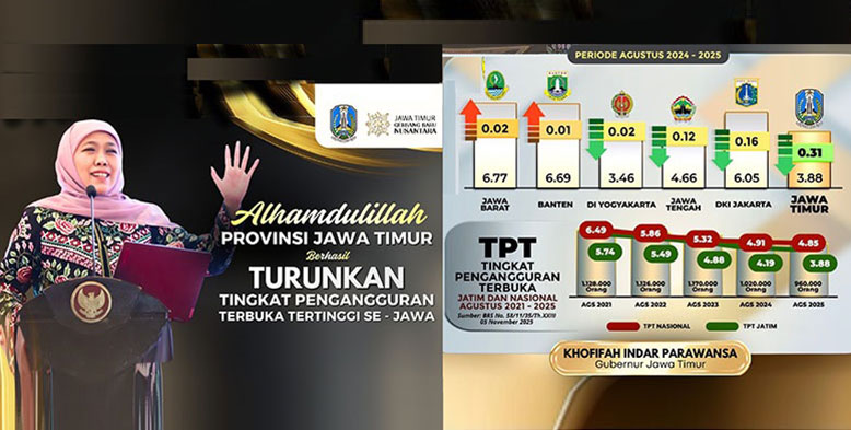 “Penurunan pengangguran tertinggi di Pulau Jawa ini adalah bukti nyata bahwa sinergi yang dibangun selama ini telah menghasilkan pertumbuhan ekonomi yang inklusif. Inilah kekuatan kolektif Jawa Timur yang berdaya, saling menopang, dan terus bertumbuh,” tegasnya.