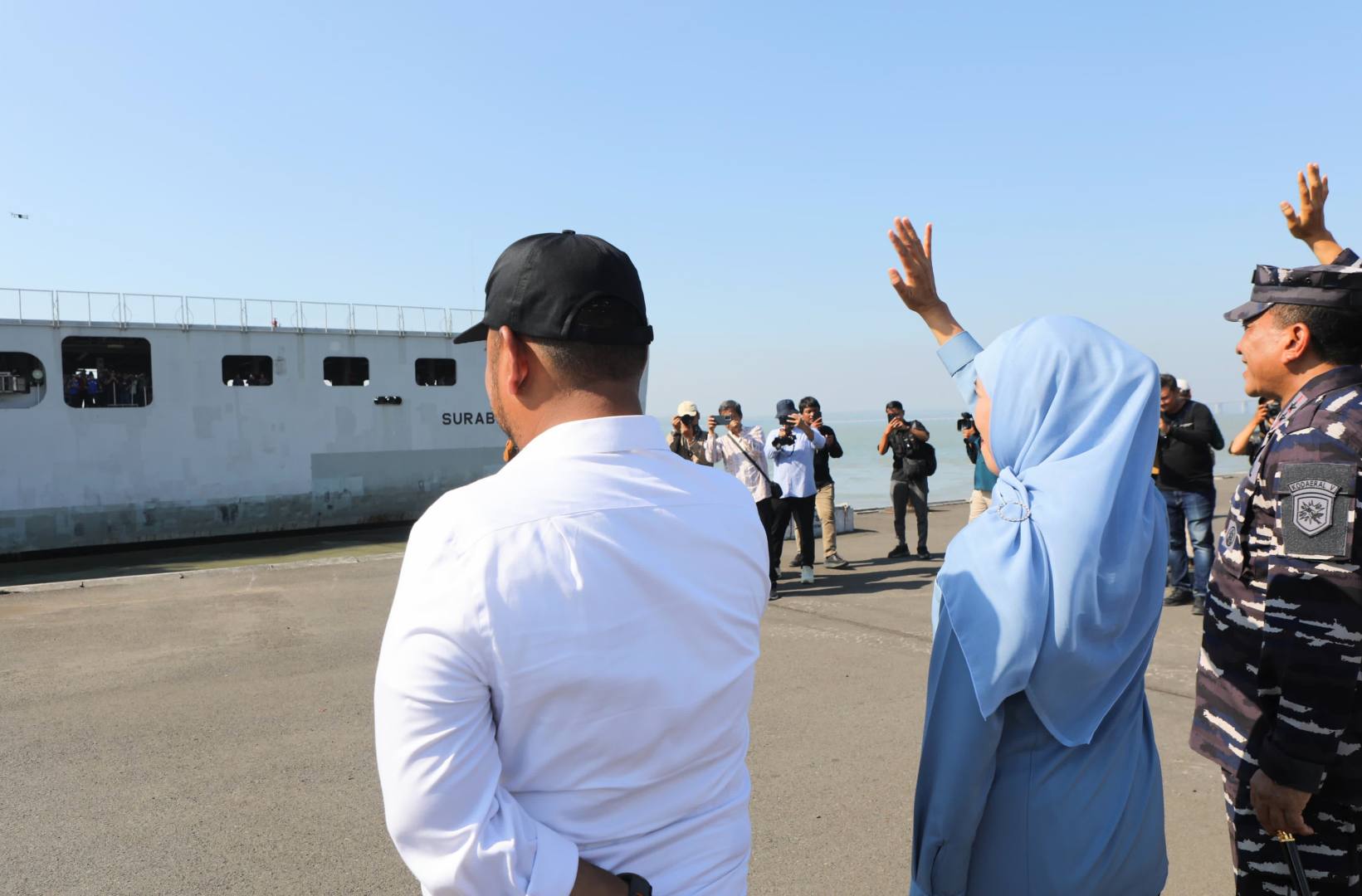 JATIMPOS.CO/SURABAYA - Gubernur Jawa Timur Khofifah Indar Parawansa kembali menunjukkan kepeduliannya terhadap masyarakat di daerah kepulauan. Kali ini, Gubernur Khofifah secara langsung melepas keberangkatan bantuan logistik untuk warga Pulau Bawean, Kabupaten Gresik, menggunakan Kapal Republik Indonesia (KRI) Surabaya 591 dari Dermaga Semampir Baru Koarmada II Surabaya, Jumat (5/9).