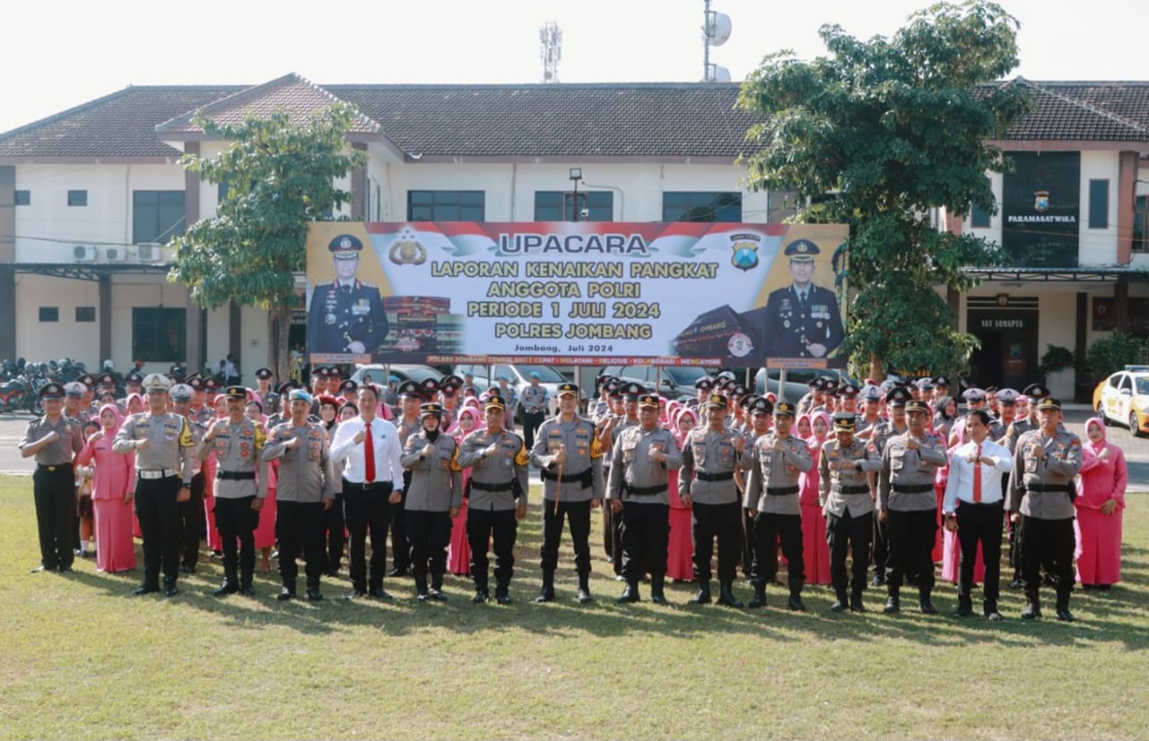 Upacara Kenaikan Pangkat digelar di Lapangan Mapolres Jombang dipimpin Kapolres Jombang AKBP Eko Bagus Riyadi, juga diikuti Pejabat utama, Kapolsek jajaran, anggota staf, personel yang naik pangkat beserta suami atau istri dan Pengurus Bhayangkari Cabang Jombang, Jum'at (05/07/2024).