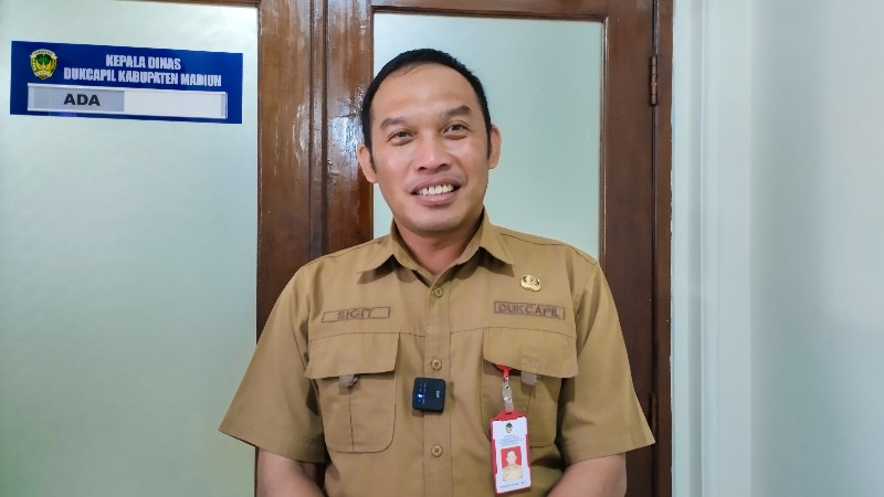 Kepala Dinas Dukcapil Kabupaten Madiun, Sigit Budiarto memberikan keterangan pers di kantornya, Selasa (15/4/2025).