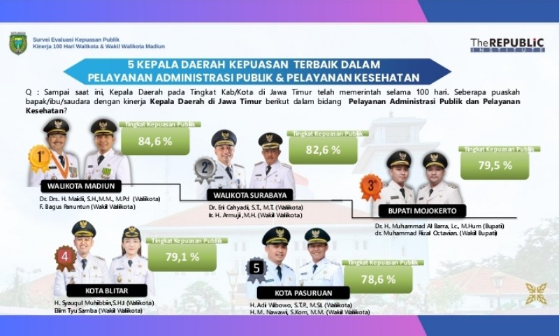 JATIMPOS.CO/KOTA MADIUN – Dalam sebuah survei terbaru yang dirilis oleh The Republik Institute, kinerja Wali Kota Madiun dan Wakil Wali Kota Madiun dalam 100 hari pertama masa jabatan mereka dinyatakan sebagai yang terbaik di antara seluruh kepala daerah di Jawa Timur. Survei ini menunjukkan tingginya tingkat kepuasan masyarakat terhadap program-program strategis dan pelayanan publik yang telah dijalankan sejak awal kepemimpinan mereka.