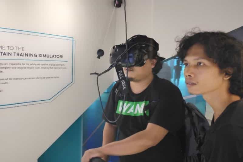Seorang pengunjung tengah mencoba ‘Bus Captain Training Simulator’ di Singapore Mobility Gallery, Jumat (20/12/2019).