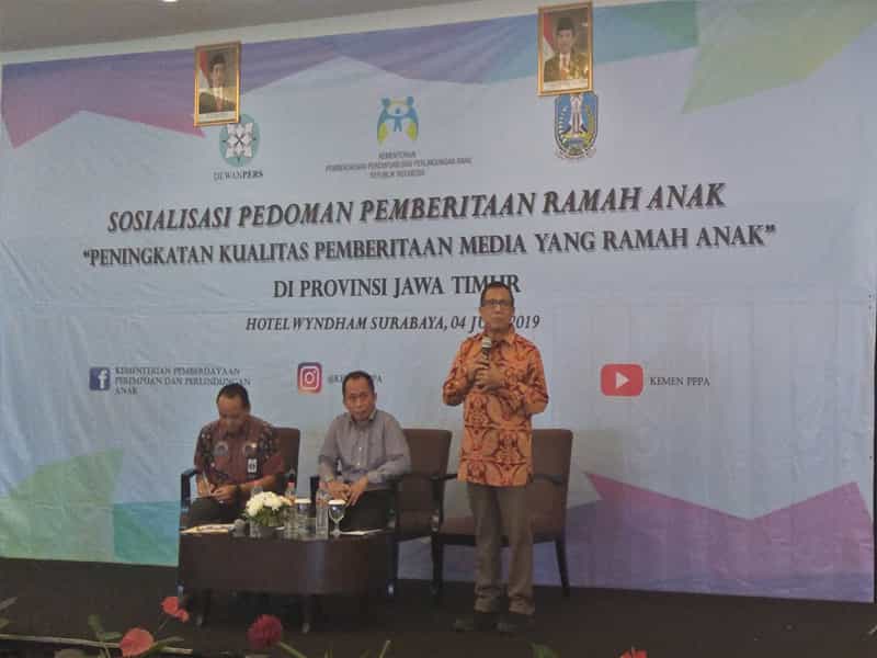 Topik ini jadi bahasan menarik dalam acara Sosialisasi Pedoman Pemberitaan Ramah Anak, di Hotel Wyndham Surabaya, Kamis (4/7). Acara yang digelar oleh Kementerian Pemberdayaan Perempuan dan Perlindungan Anak (KPPPA) dan Dewan Pers ini, diikuti oleh 56 wartawan dari media cetak, televisi, radio, dan siber.