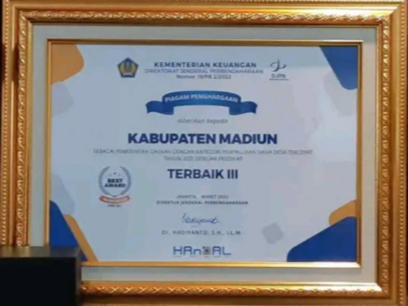 JATIMPOS.CO/KABUPATEN MADIUN - Dirjend Perbendaharaan Kementerian Keuangan Republik Indonesia mengapresiasi Bupati Madiun, H. Ahmad Dawami dengan memberikan penghargaan sebagai pemerintah daerah dengan kategori penyaluran Dana Desa tercepat tahun 2021 dengan predikat terbaik III tingkat nasional di Pendapa Muda Graha Kabupaten Madiun, Senin (11/4/2022).