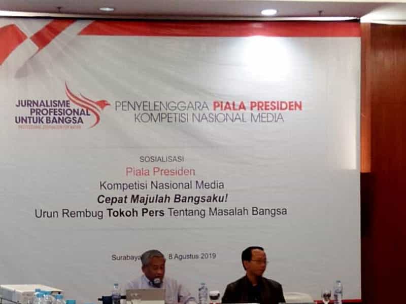 JATIMPOS.CO//SURABAYA- Untuk mengindentifikasi masalah dan sekaligus mencari solusi persoalan yang dihadapi bangsa Indonesia, digelar Kompetisi Nasional Media Piala Presiden 2019. Pada Kamis (8/8) panitianya menggelar Urun Rembug Tokoh Pers, Sosialisasi Kompetisi Nasional Media Piala Presiden 2019 di Hotel Santika, Jemursari Surabaya.
