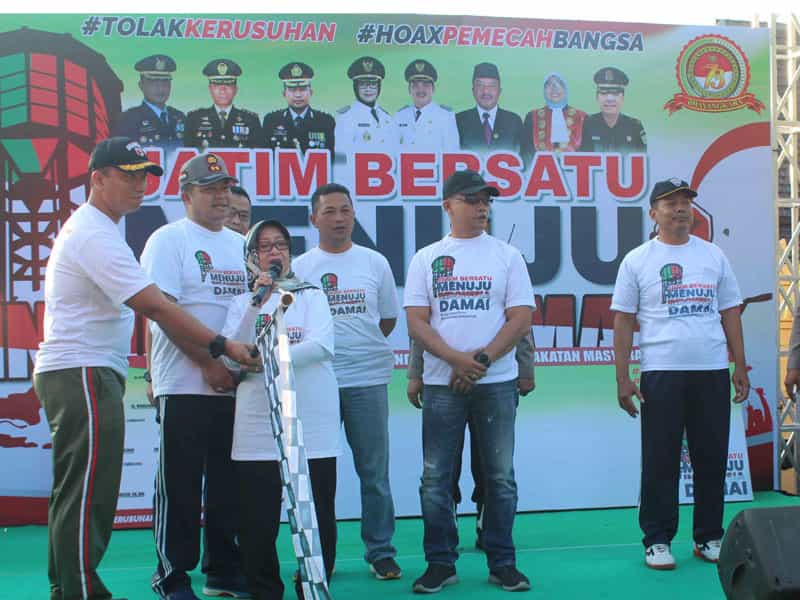 JATIMPOS.CO//JOMBANG- Ribuan warga Jombang mengikuti jalan santai HUT Bhayangkara ke-73 serta Deklarasi Tolak Kerusuhan yang berlangsung di halaman Mapolres Jombang, Jl KH Wahid Hasyim, Minggu pagi (16/6/2019). Para peserta dan kalangan pejabat Forkompimda membubuhkan tanda tangan tolak kerusuhan pada papan yang telah disediakan.