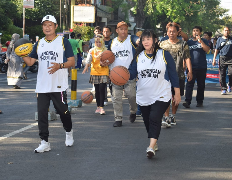 JATIMPOS.CO/LAMONGAN - Lebih dari 100 atlet bola basket se-Kabupaten Lamongan melakukan pertunjukan Dribble Basket bersama Bupati Lamongan Yuhronur Efendi berkeliling Alun-alun Lamongan, Minggu (18/9/2022).