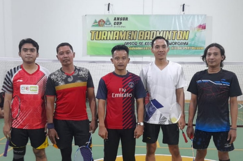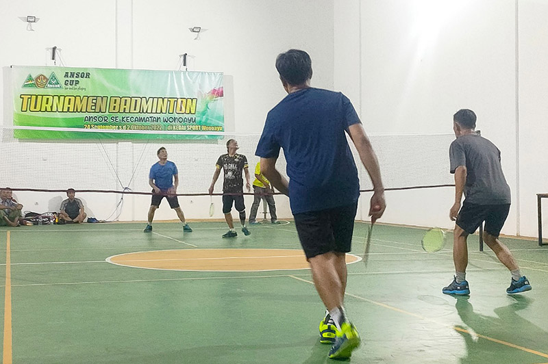 JATIMPOS.CO/SIDOARJO - Open turnamen badminton Ansor Cup Kecamatan Wonoayu Kabupaten Sidoarjo di perdelapan final malam hari ini Selasa (27/9/2022), mempertontonkan pasangan ganda Ansor Semambung vs Ansor Karangpuri.