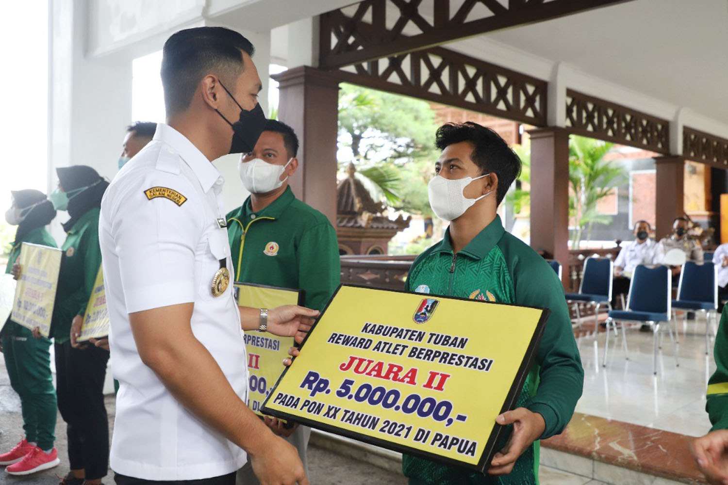 JATIMPOS.CO/TUBAN – Sejumlah atlet penyumbang medali PON XX Papua asal Tuban mendapat apresiasi dari Bupati Tuban Aditya Halindra Faridzky. Penghargaan diserahkan di rumah dinas Bupati Tuban Kompleks Pendopo Krido Manunggal.