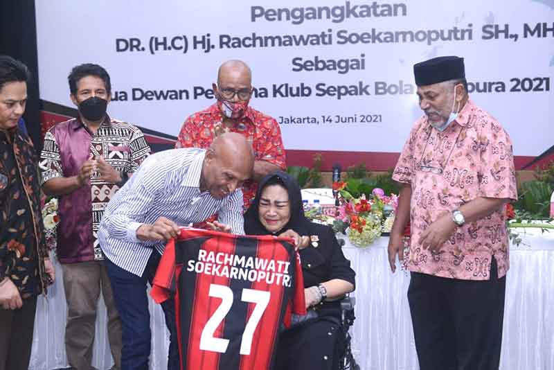JATIMPOS.CO//JAKARTA- Rachmawati Soekarnoputri tak dapat menahan haru. Air matanya mengalir saat menerima kostum Persipura dari Walikota Jayapura Benhur Tomi Mano di Aula DR. Ir. Sukarno di Universitas Bung Karno (UBK), Jalan Kimia, Jakarta Pusat, Senin (14/6).