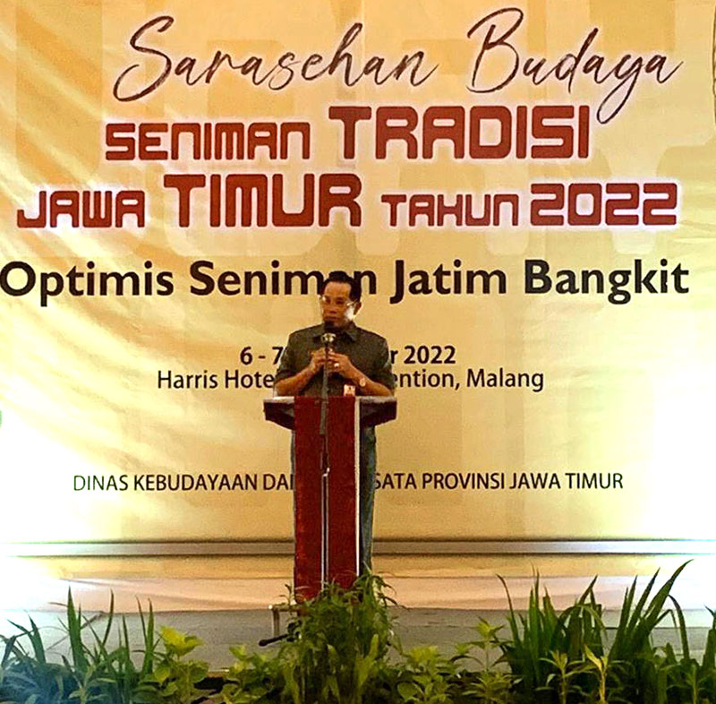 Kepala Dinas Kebudayaan dan Pariwisata Jatim, Dr. Hudiyono, M. Si. PADA pembukaan kegiatan “Sarasehan Budaya Seniman Tradisi Tahun 2022” di Harris Hotel Malang, hadir dan memberikan sambutan. Berikut ini pernyataannya :