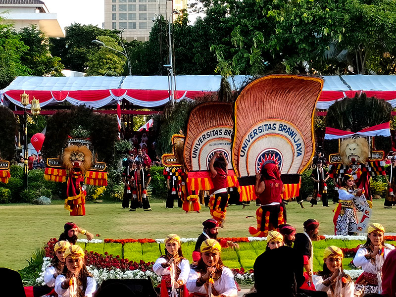Tim Reog dari Universitas Brawijaya yang merupakan juara 1 Festival Nasional Reog Ponorogo 2023. Tim pendukung ini terdiri 250 orang dari Universitas Brawijaya Malang dan SMKN 12 Surabaya. Atraksi ini ditampilkan saat penurunan bendera sore hari di Grahadi Surabaya (17/8/2023).