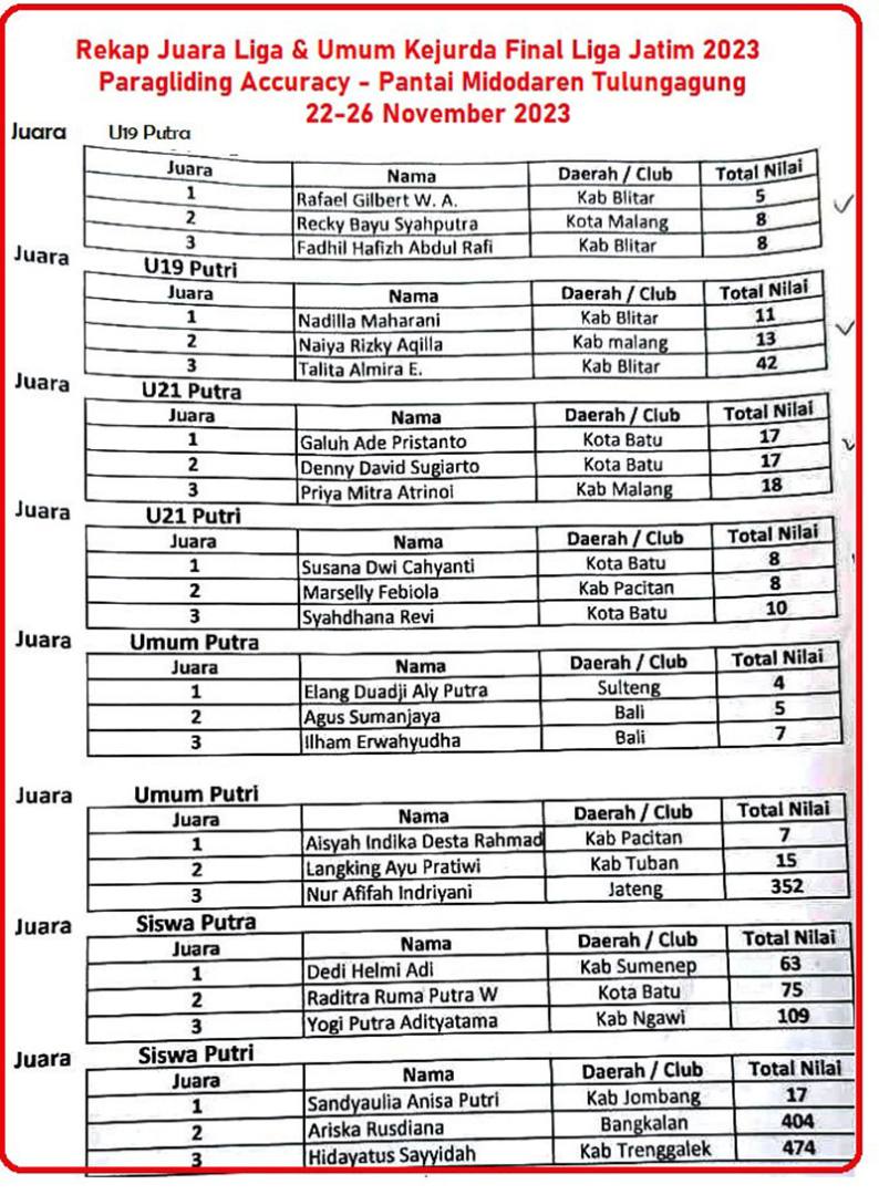 Diakhir kegiatan ini ditetapkan pemenang lomba dan diberikan uang pembinaan kepada seluruh pemenang, Liga Paralayang Seri-5 Jawa Timur Tahun 2023.