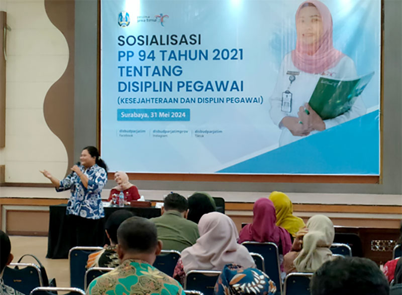 JATIMPOS.CO/SURABAYA- Untuk meningkatkan semangat, wawasan dan etos kerja serta kualitas dan pemahaman ASN dilingkungan Dinas Kebudayaan dan Pariwisata (Disbudpar) Provinsi Jatim, diselenggarakan Sosialisasi PP 94 Tahun 2021 Tentang Disiplin Pegawai (Kesejahteraan dan Disiplin Pegawai).
