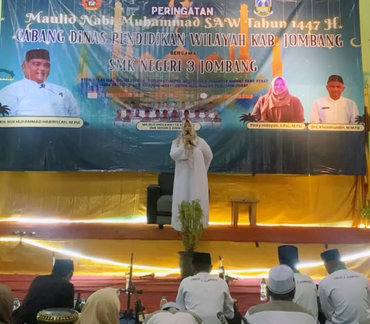 JATIMPOS.CO/JOMBANG -Plt Kepala Cabang Dinas Pendidikan (Kacabdindik) Wilayah Jombang, Pinky Hidayati, SPsi. MPsi, menghadiri kegiatan Maulid Nabi SAW 1447 Hijriah di gedung aula SMK 3 Jombang, Jum'at pagi (19/9/2025).