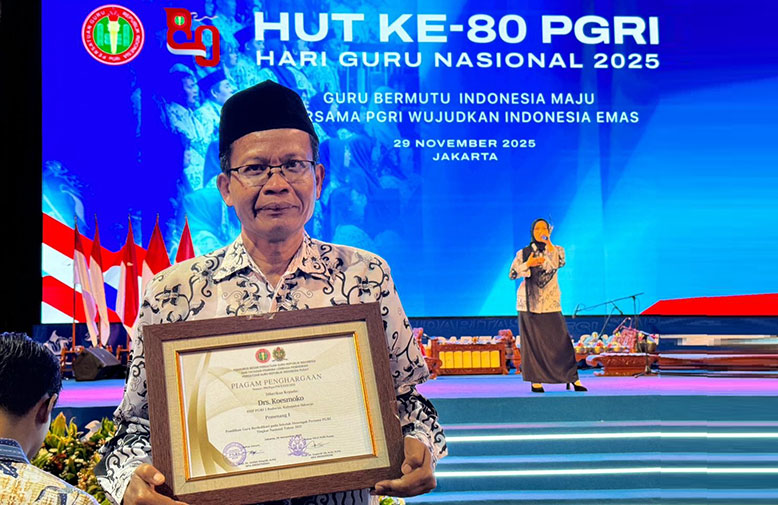 JATIMPOS.CO/SIDOARJO- Guru PGRI 1 Buduran, Sidoarjo menorehkan prestasi tingkat nasional. Drs. Koesmoko, guru Bahasa Jawa SMP PGRI 1 Buduran mendapat anugerah penghargaan sebagai Juara 1 Guru Berdedikasi SMP PGRI tingkat nasional 2025.