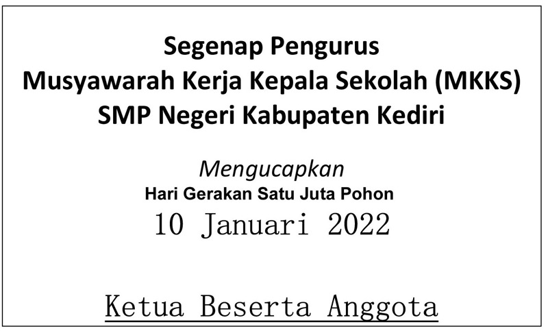 JATIMPOS.CO//KEDIRI- Segenap Pengurus Musyawarah Kerja Kepala Sekolah (MKKS) SMP Negeri Kabupaten Kediri, Ketua beserta Anggota Mengucapkan : Hari Gerakan Satu Juta Pohon 10 Januari 2022.