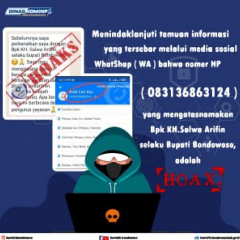 Menindaklanjuti temuan informasi yang tersebar melalui media sosial WhatsApp (WA) dengan nomor HP 083136863124, maka Dinas Komunikasi dan Informatika (Kominfo) Bondowoso mengklarifikasi melalui Tim Cyber dipastikan bahwa Nomor tersebut bukan milik Bupati Bondowoso.