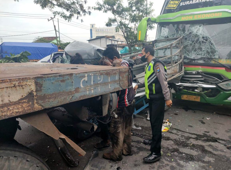 "Tiba-tiba muncul dari arah sama, Bus PO Sinar Mandiri Mulya tersebut yang akan menuju ke terminal Purabaya. Namun sopir bus tidak bisa menguasai laju kendaraannya serta tidak bisa mengontrol kecepatannya, sehingga menabrak 2 kendaraan yang berada didepannya (truk mogok dan pickup service)," terang Bunari.