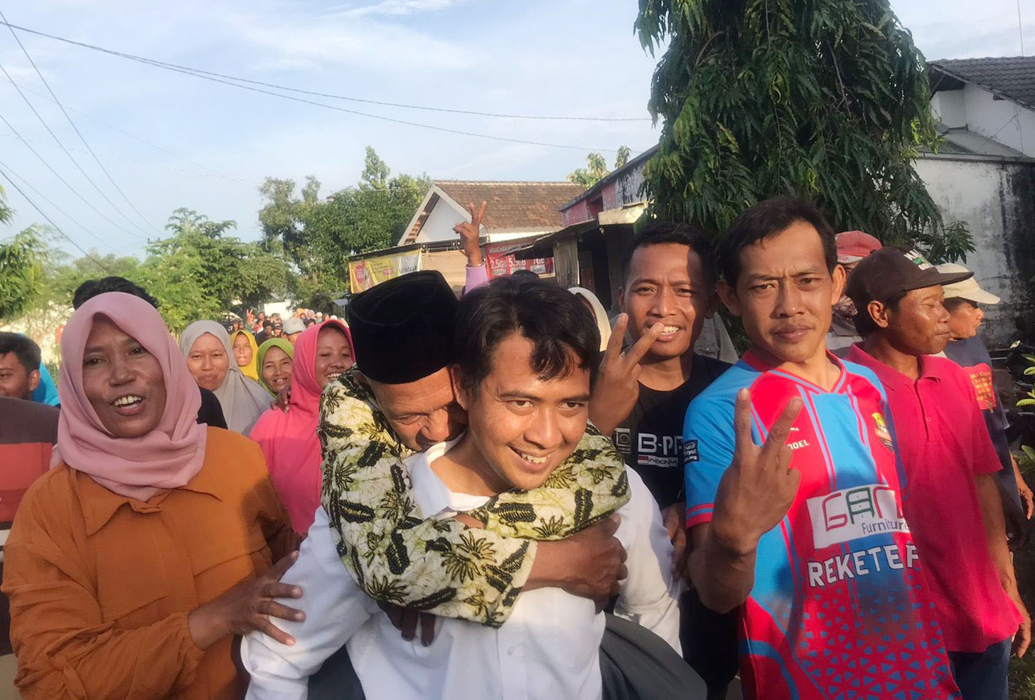 Ekspresi gembira ditunjukkan Ahmad Roziqin usai mendapat poin penuh. Dirinya menggendong ayahnya dari balai desa hingga rumah didampingi bebotoh dan diiringi yel-yel kemenangan.