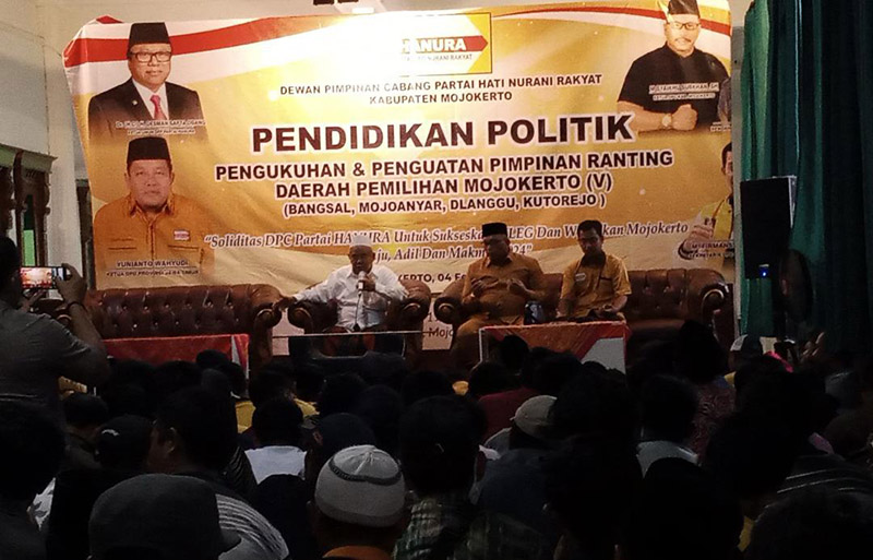 Kegiatan politik yang diikuti sekitar 500 orang terdiri dari Fungsionaris, Pimpinan Ranting, dan Team Sukses dari Bacaleg Hanura DPRD Kabupaten Mojokerto yang juga jabat Ketua DPC Hanura Kabupaten Mojokerto, M. Syaichu Subhan, terlebih dahulu diisi acara istighosah yang dipinpin oleh Prof. Dr. KH. Asep Saifudin Chalim MA pendiri IKHAC Pacet Mojokerto.