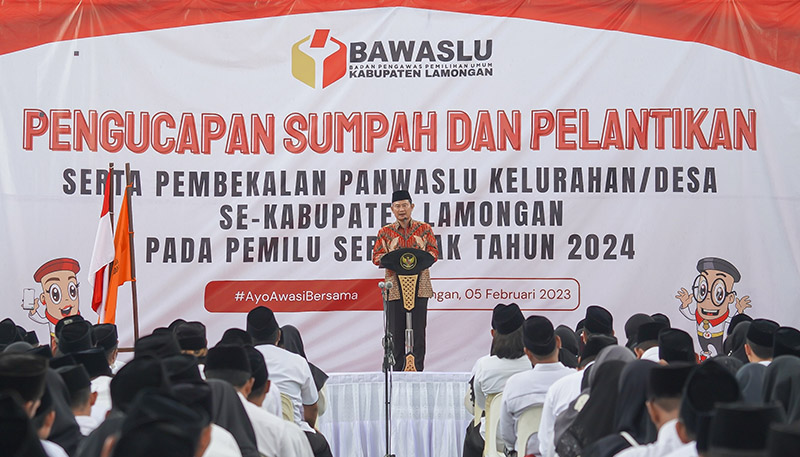 Salah satunya dengan melantik dan mengambil sumpah Panitia Pengawas Pemilu Kelurahan/Desa (PKD) oleh Ketua Bawaslu Lamongan Miftahul Badar, di GOR Kantor Dinas Pendidikan Lamongan, Minggu (5/2/2023).