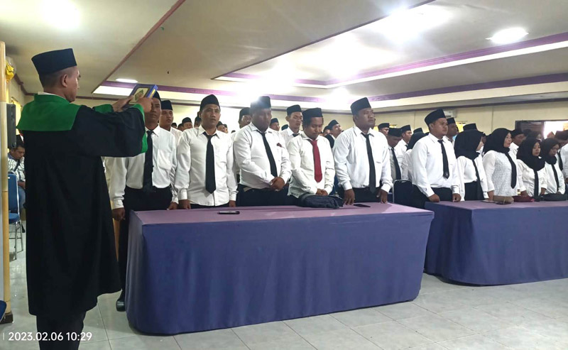 JATIMPOS.CO/SAMPANG - Badan Pengawas Pemilu (Bawaslu) Kabupaten Sampang melantik sebanyak 186 Pengawas Kelurahan dan Desa (PKD) untuk pemilu 2024, di aula Hotel Camplong Sampang, Senin (6/2/2023).