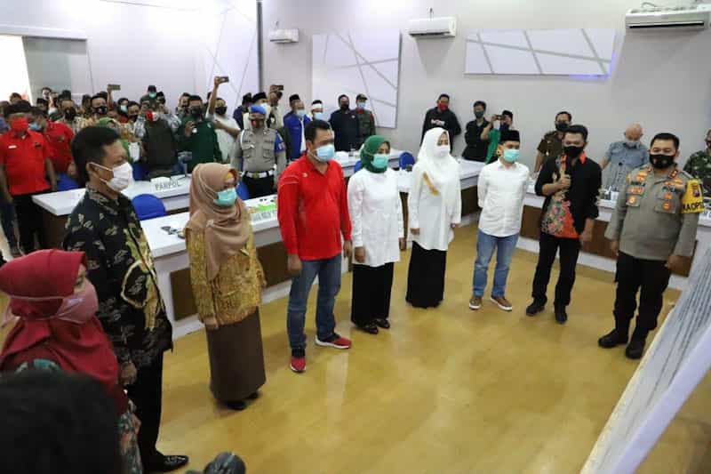 JATIMPOS.CO/KABUPATEN MOJOKERTO - Demi menjaga stabilitas keamanan menjelang Pilkada Kabupaten Mojokerto tanggal 9 Desember 2020, ketiga paslon yang bertarung pada kontestasi Pilkada Mojokerto yakni Pungkasiadi-Titik Masudah (Puti), Ikfina Fahmawati-Muhammad Al Barra (Ikbar) serta Yoko Priyono-Choirunnisa (Yoni), bersama-sama deklarasikan komitmen Pilkada damai dengan tetap menerapkan disiplin protokol kesehatan.