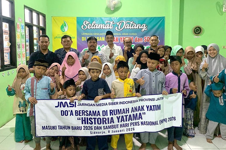 JATIMPOS.CO/SURABAYA - Mengawali tahun baru dan menyambut Hari Pers Nasional (HPN) 2026 pengurus Jaringan Media Siber Indonesia (JMSI) Provinsi Jawa Timur menggelar do’a bersama di rumah anak yatim “Historia Yatama”, Waru Sidoarjo pada Kamis (8/1/2026).
